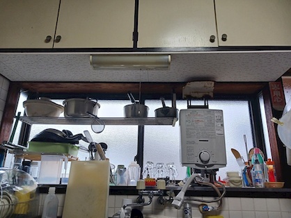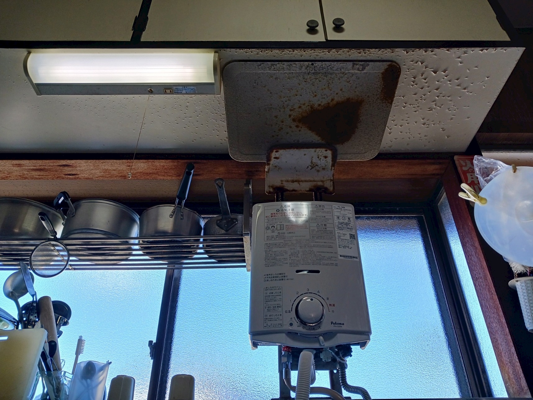 湯沸器の排気ガードが設置されていますが、50年経つとどうしても木材が劣化します。